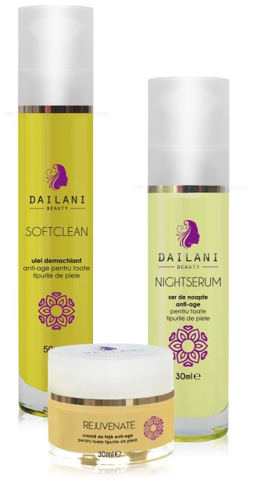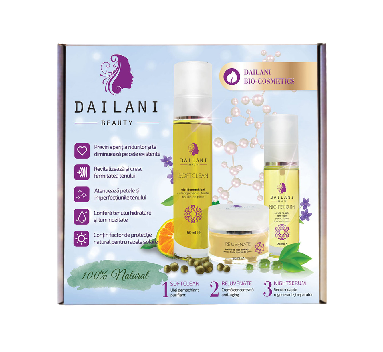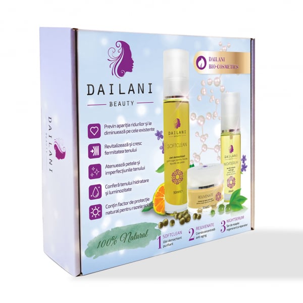 **Setul de îngrijire Dailani** oferă o rutină completă pentru ten: hidratare intensivă pe timpul zilei, regenerare profundă pe timpul nopții și curățare delicată dar eficientă. Toate produsele sunt 100% naturale, fără apă și fără parabeni, formulate exclusiv cu ingrediente BIO.